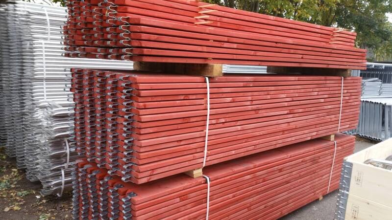 10 Kaders 8 Regelbare voeten spindel 60cm 4 Eindleuningkaders bovenaan zijkant 3 Diagonalen 10 Dubbele Leuningen 3.07m of 3.00m 2 Dubbele kopse leuningen 3 Aluminium /multiplex of volledig aluminium ladderopgangen 3.07 x 0.61 of 3.00 x 0.61m 7 Kantplanken 3.07m of 3.00m 6 kantplanken kopse kant 6 Muurankers 50cm 6 Haakse koppelingen 6 Oogbouten 4 Aluminium vloeren of 4 Robuust vloeren