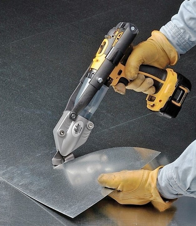 Professioneel gereedschap die nodig is voor het snel en probleemloos snijden in lengte- en dwarsrichting van plaatstaal - vlakke platen, trapeziumplaten met een laag profiel en metalen tegels.